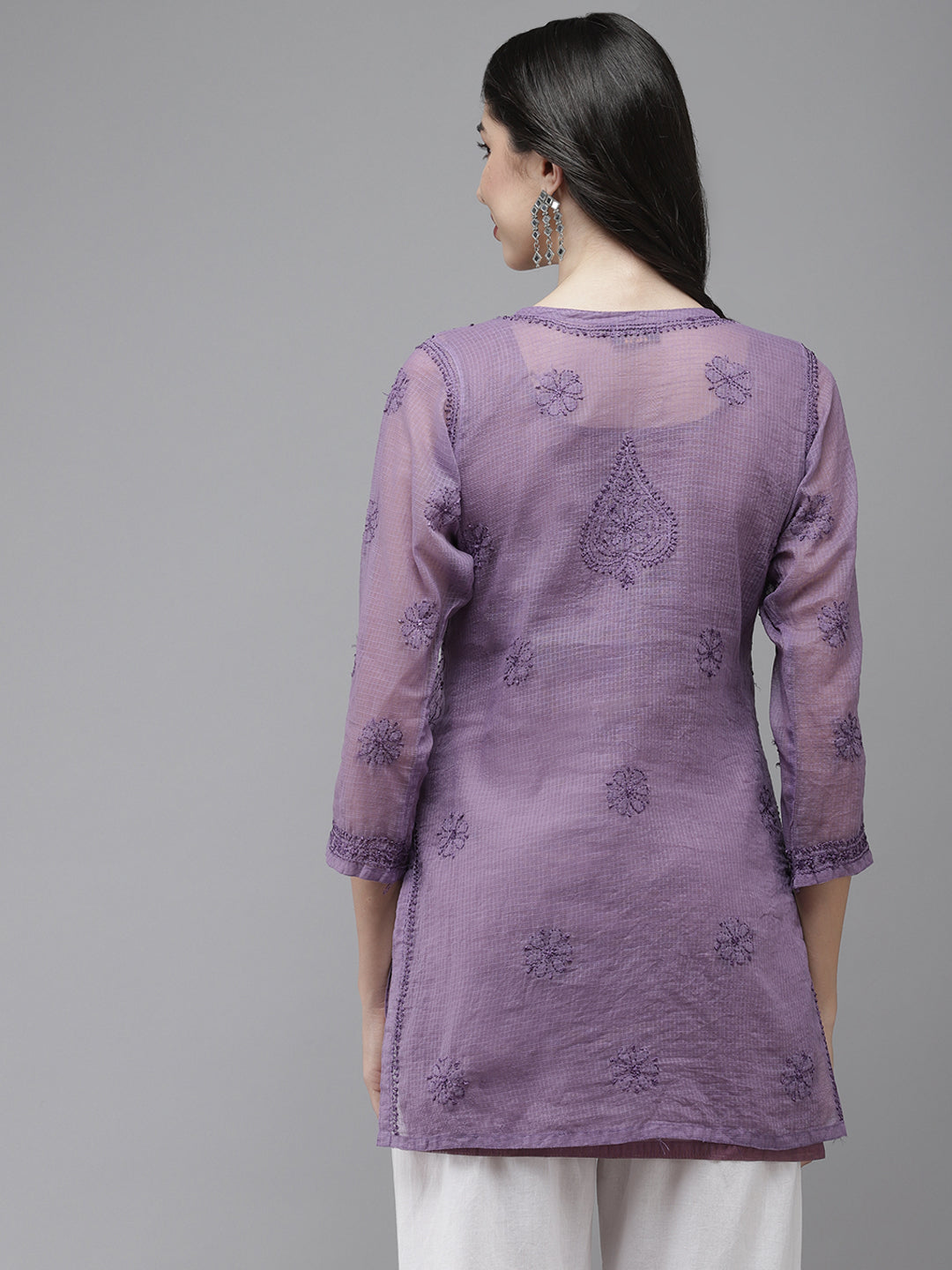 A royal touch to your wardrobe, this purple Kota tunic features delicate Chikankari embroidery, combining grace and vibrancy.
