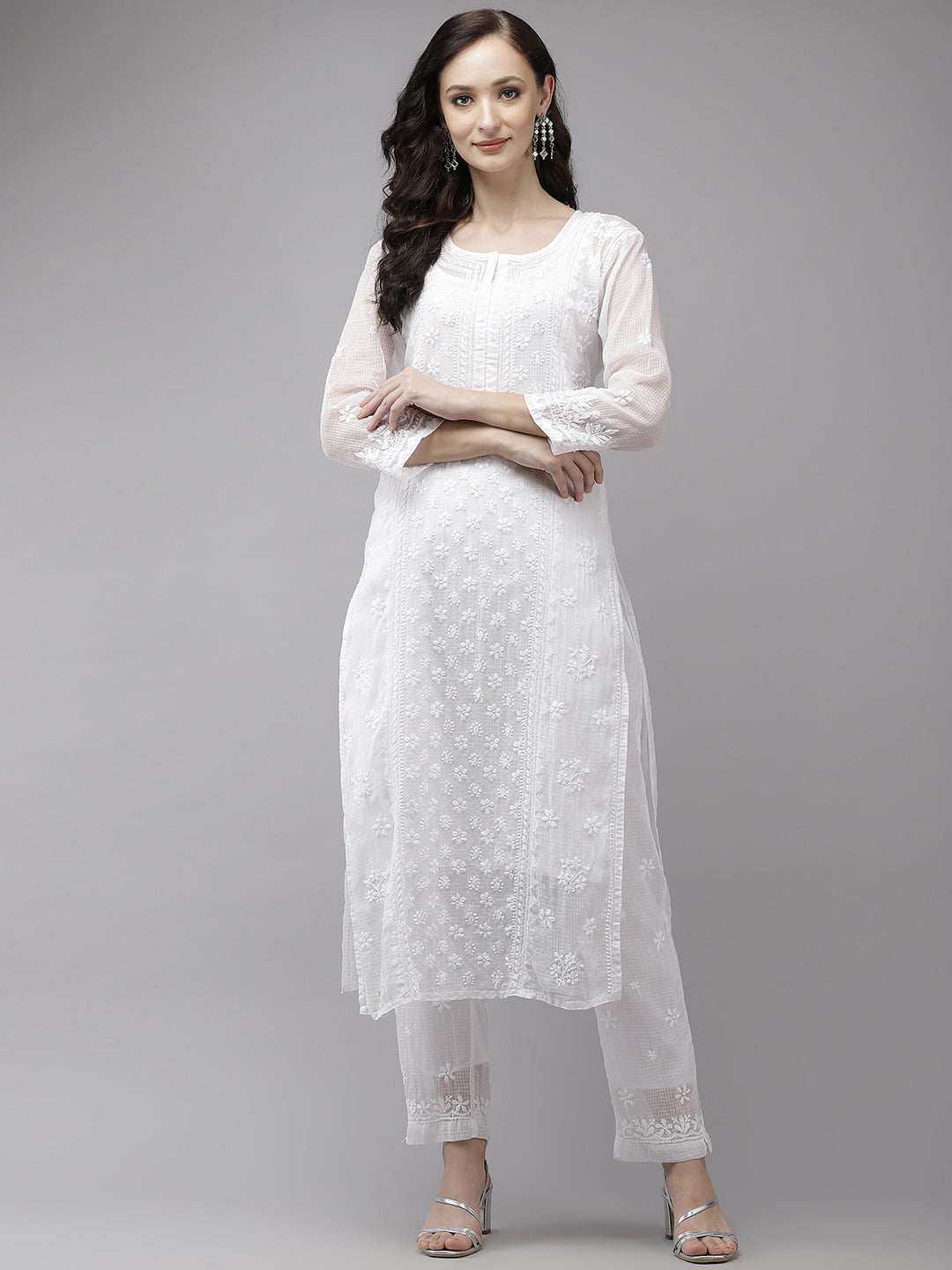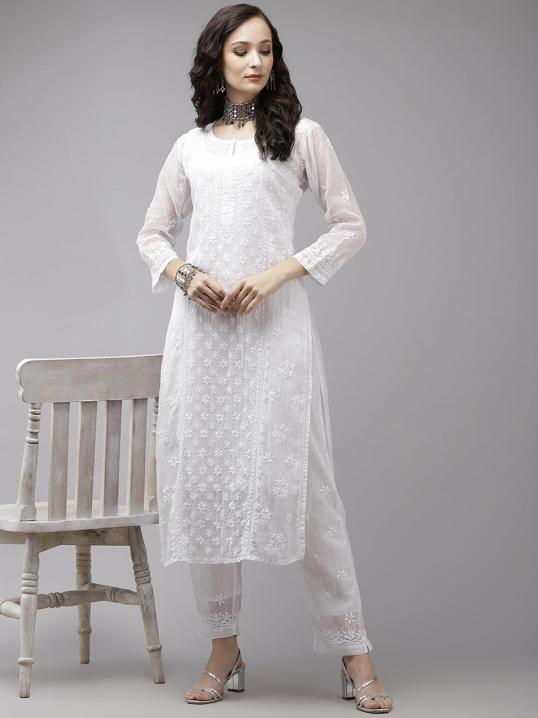 This is a White Kota Embroidered Chikankari 2-Piece Kurta Set