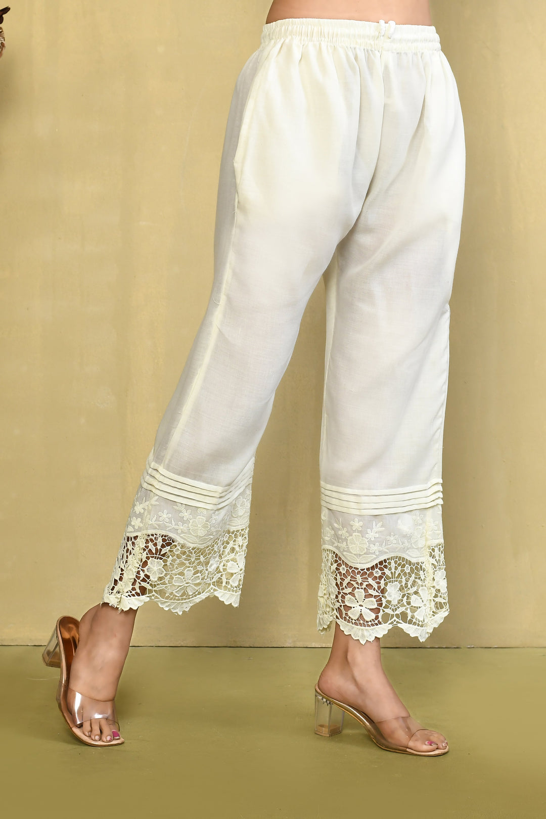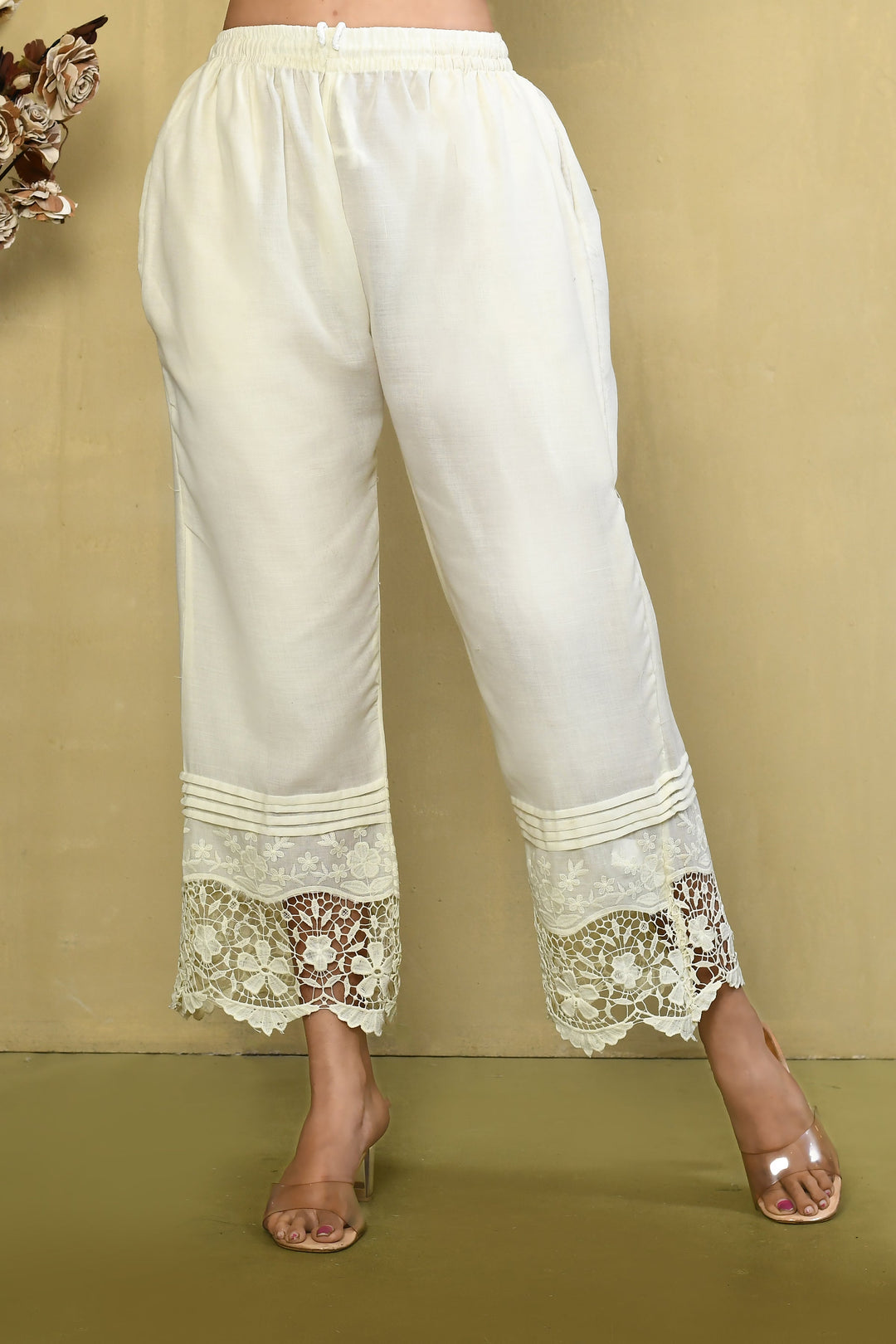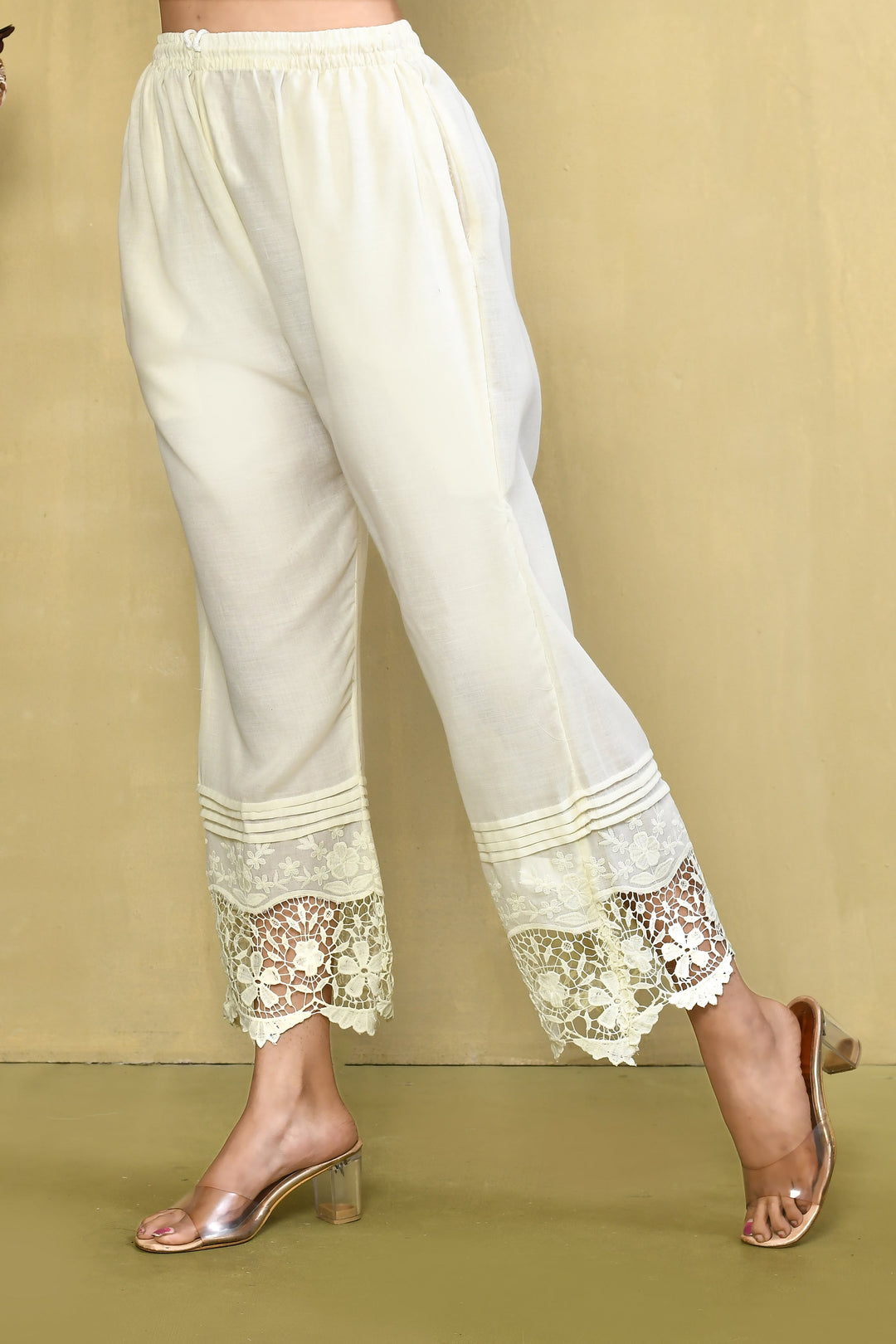 Embrace the charm of our Off-White Straight Pant adorned with Jaali Cutwork. The intricate design adds a hint of traditional allure, making it a perfect choice for various occasions. Whether paired with ethnic or contemporary tops, this pant effortlessly combines style and comfort.