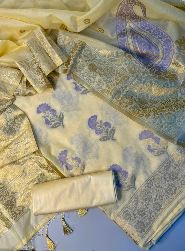 This Is A Butterscotch Yellow With Lavendar Meenakari And Zari Uber Luxe Cotton Silk Jamdani Zari Woven Full Unstitched Set With Kurta Dupatta And Bottoms