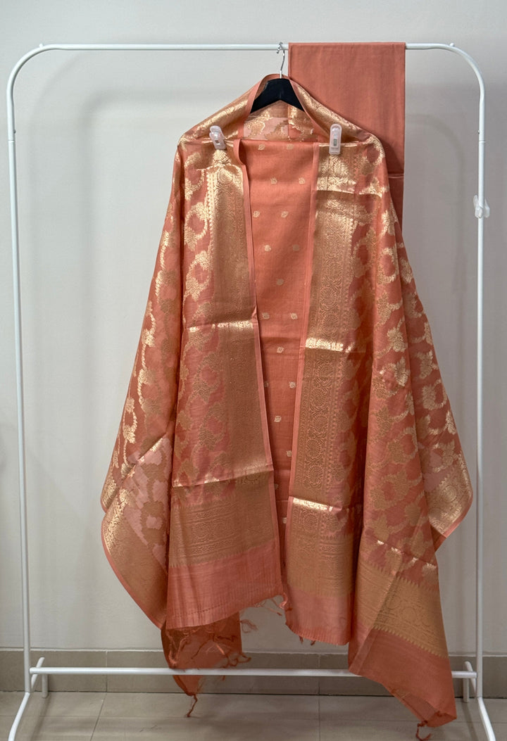 This is a Peach Pure Banarasi Chanderi Silk zari woven full unstitched set with Kurta Dupatta and bottoms