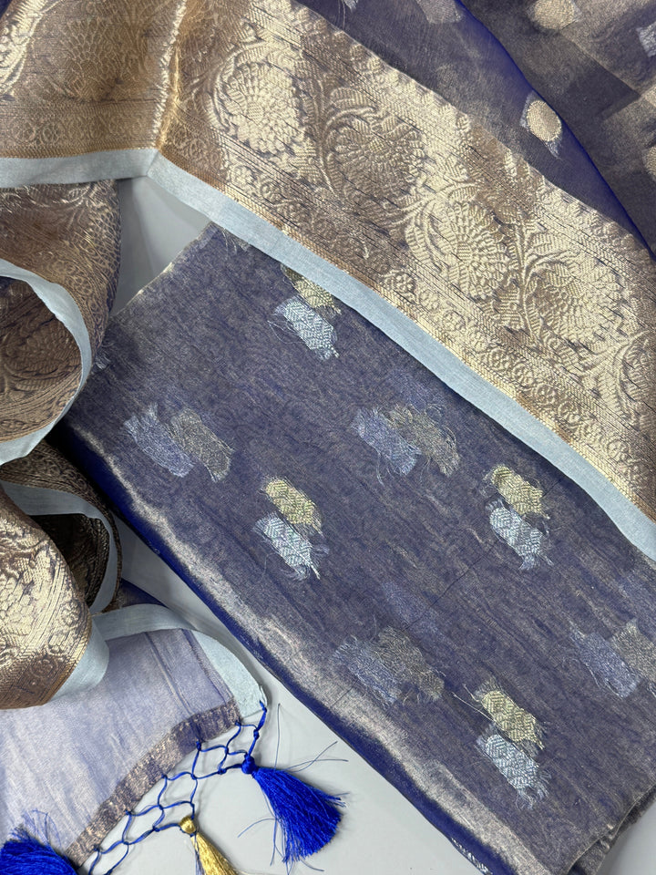 This Is A Rich Pure Tissue Silk Banarasi Weave In Periwinkle Mettalic Blue Color With Zari Bootas Unstitched Set With Kurta Dupatta .