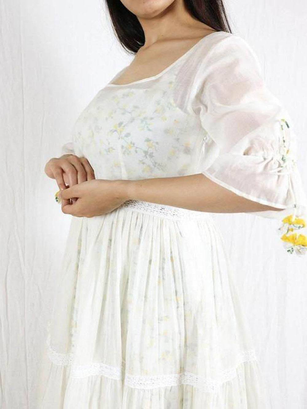 Presenting A Gown Features Peach Georgette Embroidered Yoke With Front And Back Boat Neckline, Pleated Sleeves, Yoke Until Natural Waist, Featuring A Keyhole In The Front Followed By A Peach Net Half-Circular Flare Until Calf-Length Plus Gathers From Calf To Floor-Length, Comes With Side Zip Closure. Features Stunning Motif On The Keyhole.