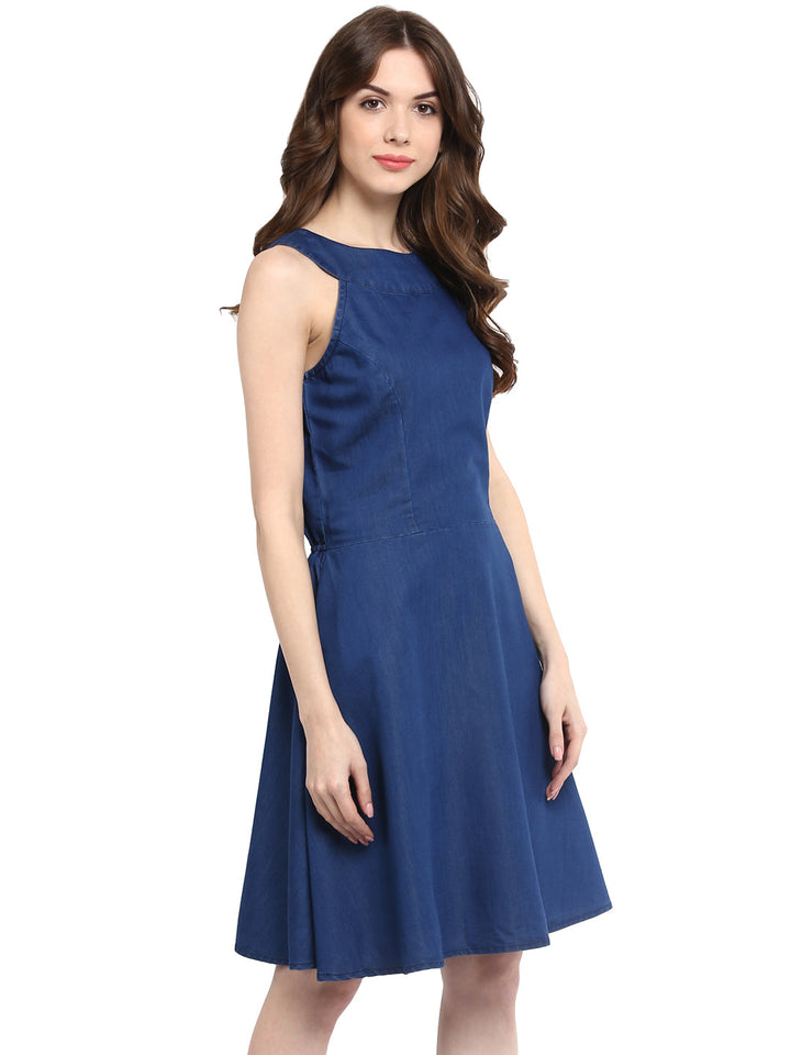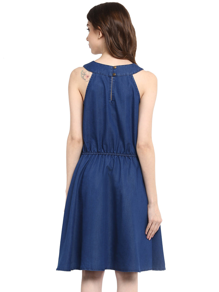 This Sleeveless Denim Dress Features A Classic Round Neck And A Flattering Straight Cut. Its Solid Tone And Clean Lines Offer A Timeless Casual Wear Option.