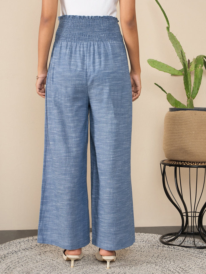 This is a Blue Self Design Smocked Waist Pants