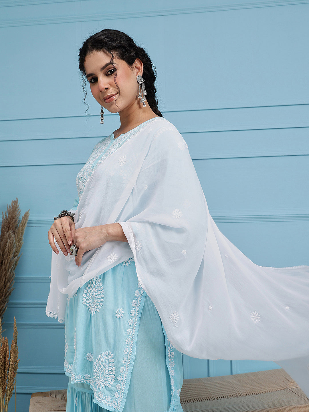 This is a White Poly Georgette Floral Chikankari Sustainable Handloom Dupatta