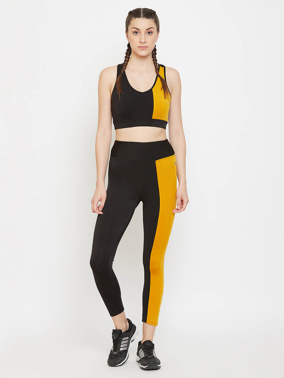 Black And Mustard Colourblock Ankle-Length Tights. Crafted With Soft Moisture Wicking Polyamide Fabric. Has Great Elasticity, Resistant To Perspiration And Comfortable Soft Elastic At The Waistband Leg Openings For A Snug Fit. Has Broad Elastic For Extra Tummy Support. Elastic Enclosed In A Soft Fabric For Utmost Comfort. Provides Ease Of Movement And Avoids Wear Or Tear. Maximises Flexibility, Mobility Performance.